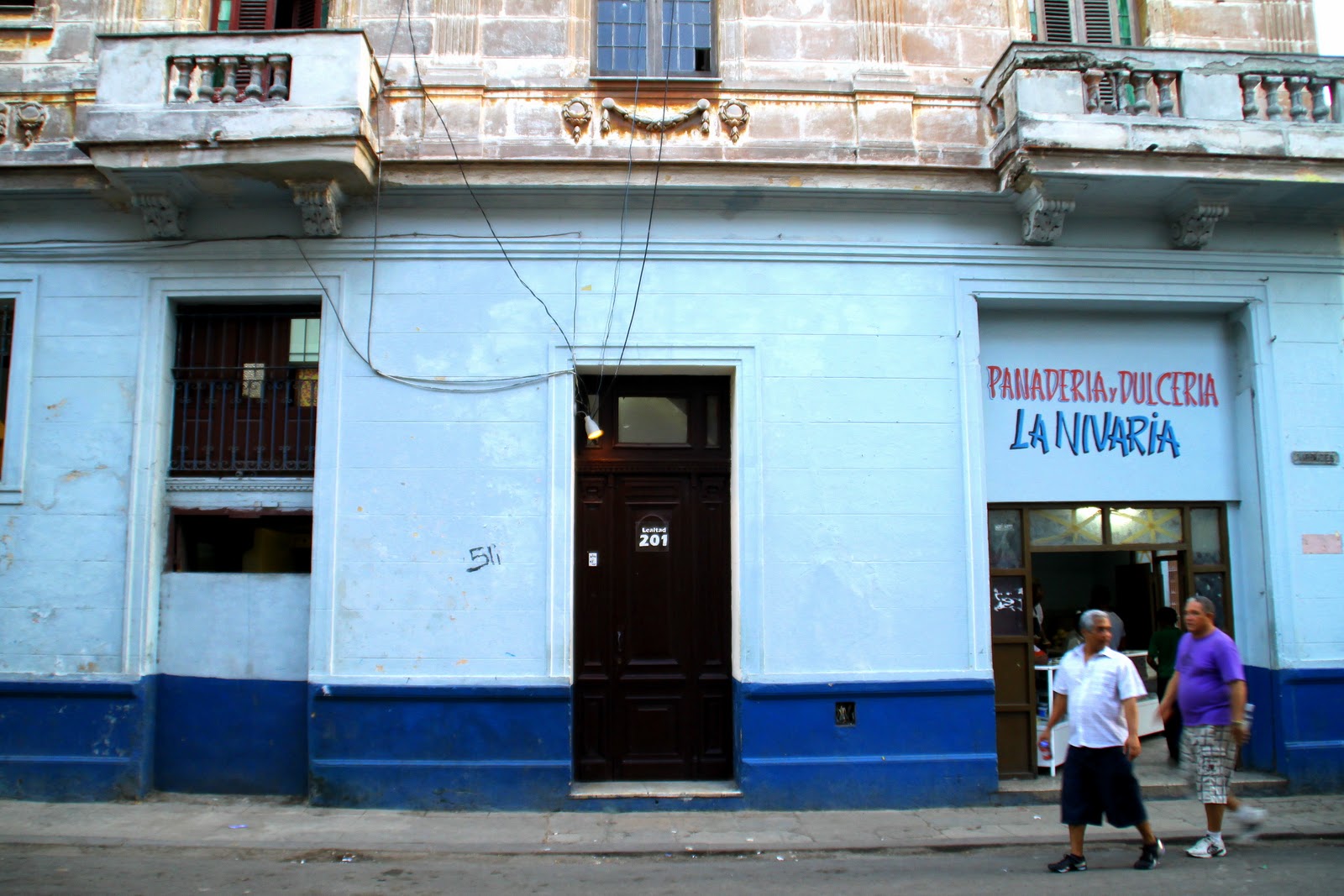 The entrance is a tall, brown door to the left of "La Panaderia y Dulceria 'La Nivaria'"